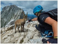 Im Gegensatz zu manch anderem "Klettersteig" in den Juliern, verdient dieser auch diesen Namen, mit Stellen bis C, inklusive einer Strickleiter. Belohnt wird man durch Kontakt zu beinahe handzahmen Steinböcken 17. Juli 2016, mit Gaby