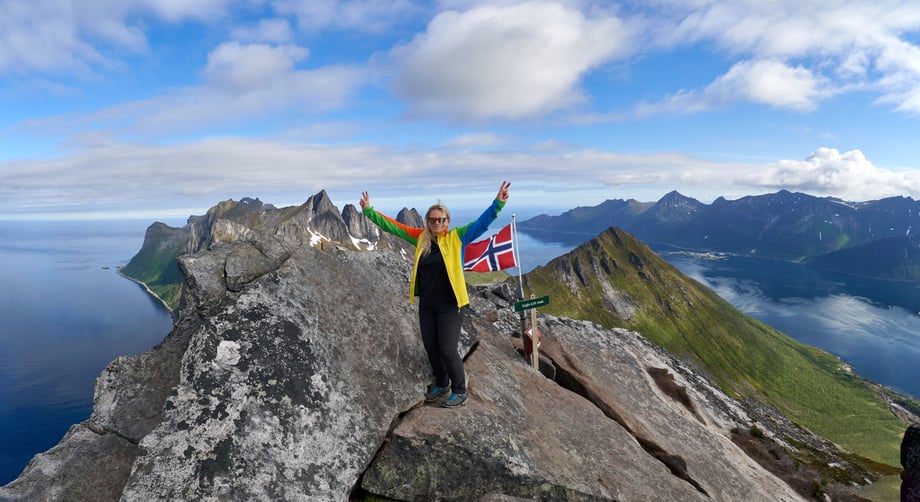 Wir starten um 03:00 Uhr früh vom Campingplatz Tromsø und eilen nach Fjordgard auf Senja, wo wir um 06:30 Uhr eintreffen. Bereits eine halbe Stunde später stapfen wir den Steig Richtung Segla hoch. Zunächst moderate Steigung durch ein lichtes Wäldchen, dann steilt es auf. Ab dem Sattel mit der Wegkreuzung steilte es so richtig auf! Hardcore-Gelände, erdig und verblockt, auf der Mefjord-Seite senkrecht, teils sogar überhängend abfallend. Gaby tigert tapfer hinauf und 2 Stunden später stehen wir neben der wehenden Norwegen-Fahne auf dem Gipfel.