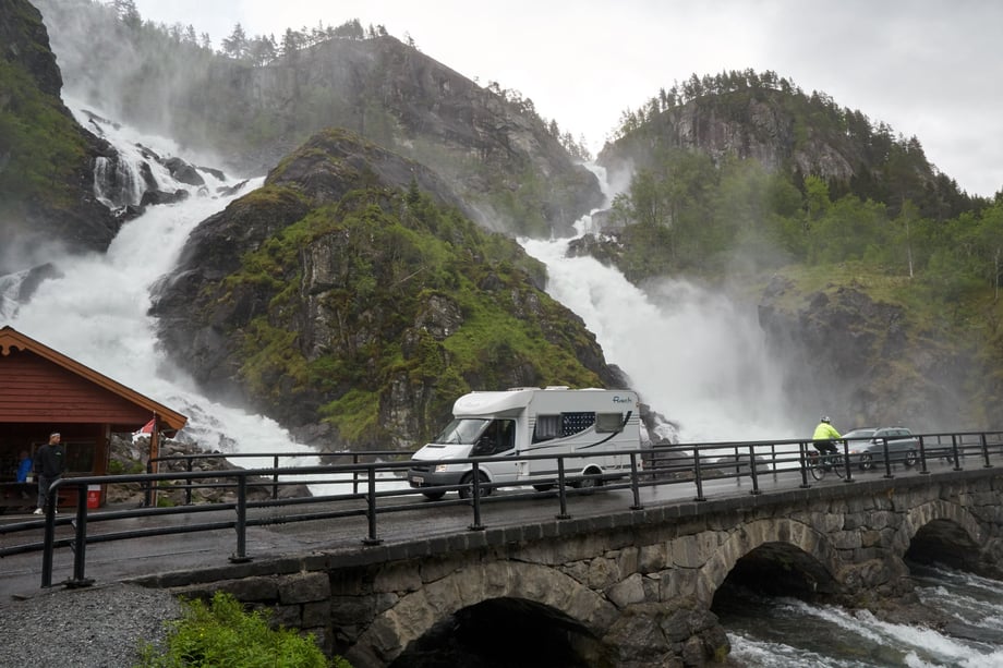 Wir sind von Lysebotn wieder durchs Kjeraggebirge retour und dann über Bykle und Hovden auf der 9 Richtung Odda gefahren. Unterwegs gab es in der Gemeinde Valle einen Stopp und in Røldal. Die Stabkirche von Røldal kann man - man möge mir das verzeihen - getrost vergessen: Von außen nichts sagend, und der Innenraum versperrt. Knapp vor Odda dann der Låtefossen, der einem - gefühlt - fast das Wohnmobil von der Brücke fegt. Kurzer Halt zur Besichtigung ist obligat.