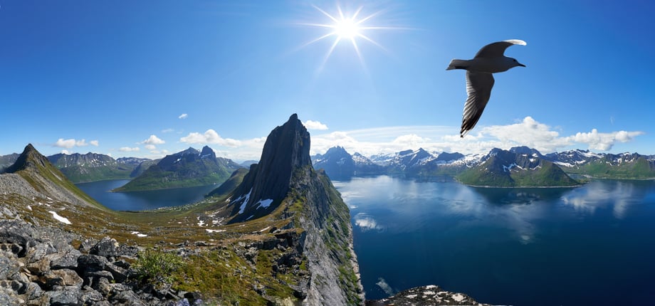 Wieder beim Wohnmobil angelangt bleibt Gaby dort und ruht sich aus, meinereiner nimmt noch einen zweiten Berg in Angriff, den Hesten. Dieser steht unmittelbar neben dem Segla und stellt daher die ideale Aussichtswarte auf den Segla dar. Es entstehen etliche Fotos, doch wir schreiben den 20. Juni, also ist Sonnenhöchststand und zu keinem Zeitpunkt des Tages steht die Sonne wirklich ideal für „epische“ Werke.