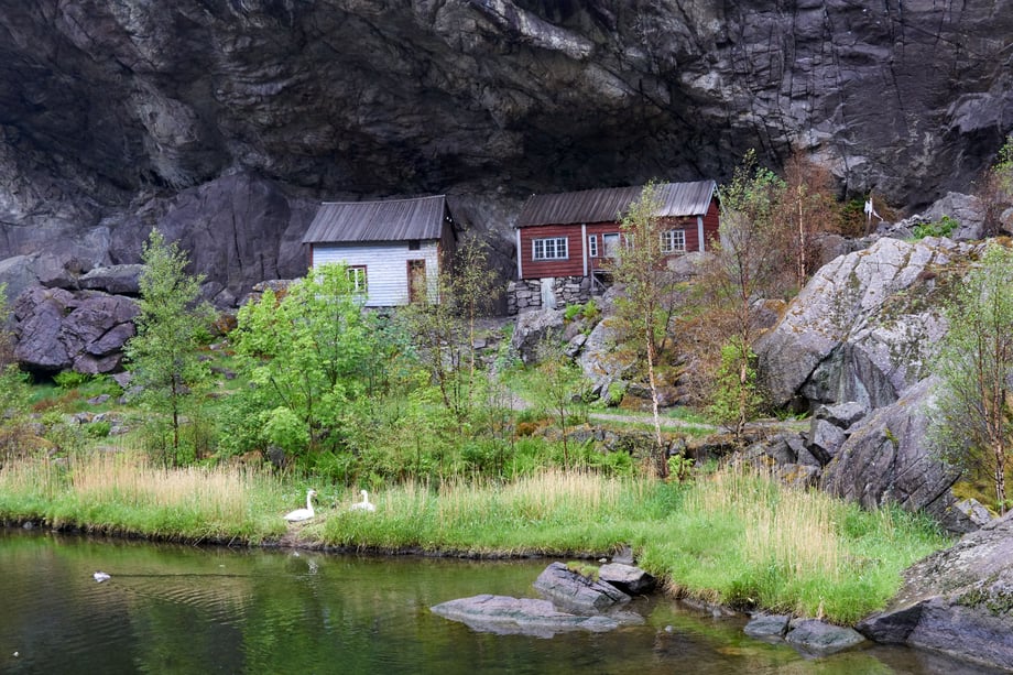 In Helleren selbst erweist sich die Fehlleitung des Navis als Vorteil, da wir Mitten im Betriebsgelände einer Firma landen, aber von dort aus einen perfekten Blick zu den alten Häusern unter dem Felsvorsprung genießen können. Ich schieße trotz Nieselregens ein paar Fotos, die Kamera passend im Regenoutfit. Die beiden Häuser unter dem Felsvorsprung sind aus dem 19. Jahrhundert, Teile der Gebäude sind aber auch älter. Wahrscheinlich gab es im 16. Jahrhundert Menschen, die auch das ganze Jahr über dort gelebt hatten, seit 1920 sind sie nicht mehr bewohnt und heute eine Art Freilichtmuseum.