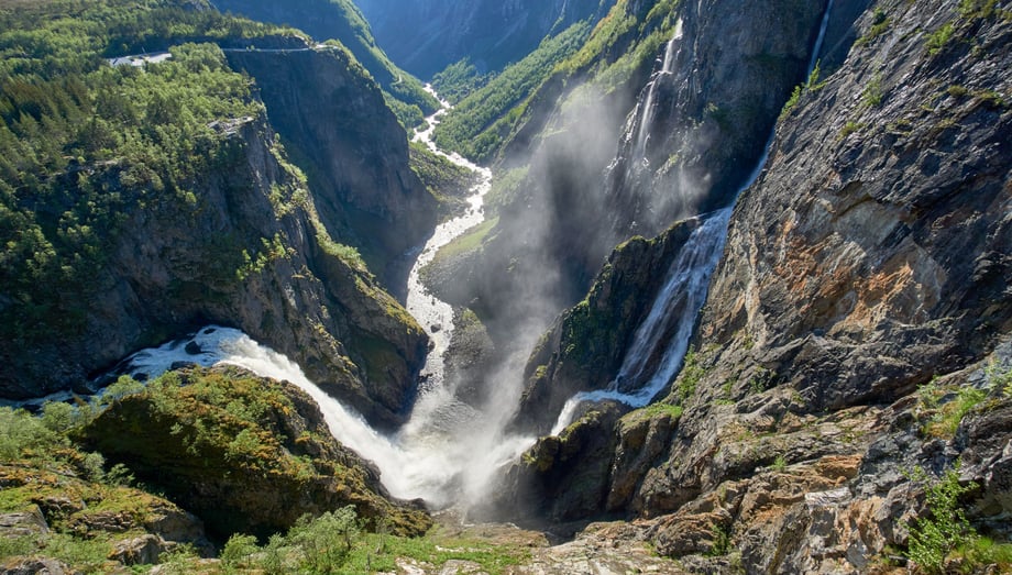 Auf Grund meiner Recherchen hätte ich den Vøringsfoss als den eindrucksvollsten Wasserfall Norwegens eingeschätzt, vor Ort wird die Vermutung bestätigt. Wir parken direkt beim „Fossli Hotell“ und es sind nur wenige Meter zur weitläufigen Aussichtsplattform, die hier errichtet wurde. Meist betrachtet man Wasserfälle von unten, dieser wird von hoch oben erlebt. „Dieser“ ist Einzahl und daher etwas irreführend. Tatsächlich sind es gleich mehrere Wasserfälle aus unterschiedlichen Richtungen, die ins Tal stürzen und, unten angelangt, gemeinsam als Fluss ihre Reise fortsetzen. Im Gegenlicht der strahlenden Sonne sieht man Gischt-Wolken tanzen, ich fotografiere viel und kann mich kaum wieder los reißen.
