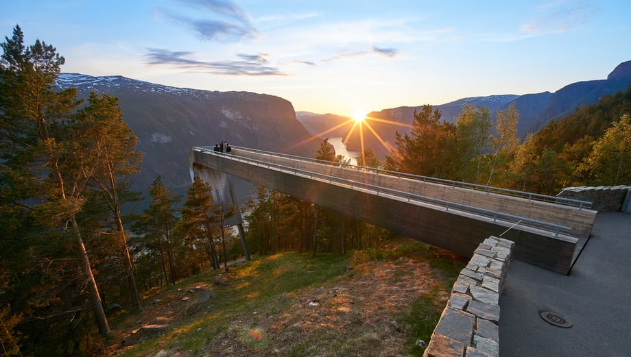 Da wir diese Nacht „wild“ stehen wollten, setze ich die Fahrt über Aurland Richtung Stegastein fort. Stegastein ist eine Aussichtsplattform, neudeutsch „Skywalk“, mit herrlichem Ausblick über den Fjord. Das Glück ist uns hold und wir erhaschten die letzten Strahlen der gerade hinter den Bergen untergehenden Sonne.