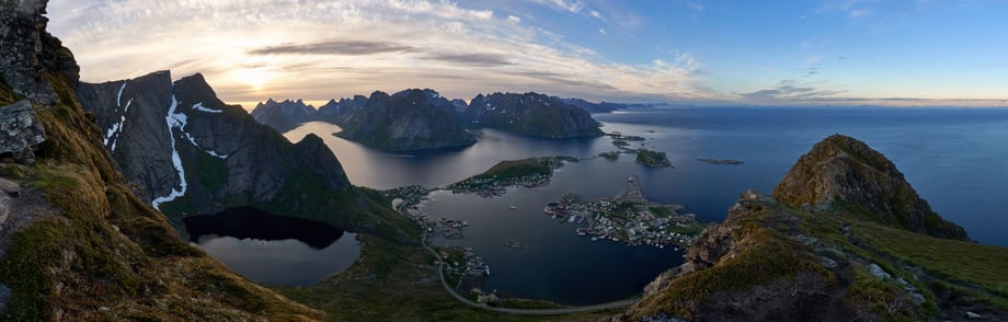 Der Hausberg von Reine, der Reinebringen, war bisher kein unbedingt leicht erreichbarer Berg. Derzeit wird der Berg gerade von einer Spezialfirma unter Beiziehung von 8 Nepalesen durch Treppenbau massentauglich gemacht. Ob das gut oder schlecht ist, sei dahingestellt. Wie auch immer, der Berg ist wegen der Bauarbeiten eigentlich gesperrt, doch ich denke mir, zu mitternächtlicher Stunde störe ich niemanden und gehe dennoch hoch. Der Ausblick ist tatsächlich überwältigend. Die Mitternachtssonne dringt durch einen Wolkenschleier und die Stimmung ist grandios.