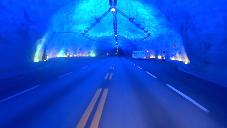 Mit etwas über 24km Länge ist der Lærdals-Tunnel der längste Straßentunnel weltweit. Zur Aufrechterhaltung der Aufmerksamkeit sind alle 6 Kilometer blau beleuchtete Buchten vorhanden, die quasi per se schon eine Attraktion sind. Man muss aber auch dazu sagen, dass es in anderen Tunneln, etwa dem Zubringer zur Hardangerbrücke, sogar Kreisverkehre im Tunnelinneren gibt, die sind dann auch blau beleuchtet. Auf Grund der vielen euphorischen Berichte, die ich gelesen hatte, habe ich mir eigentlich dennoch mehr erwartet, als lediglich diese 3 blauen Buchten.