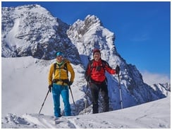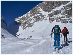 In dieser Saison ist die Schneelage für rassige Julier-Touren kaum geeignet; Es ist dennoch gelungen, ein echtes "Zuckerl" genießen zu können, nämlich eine Überschreitung der Bärenlahnscharte aus dem Seebachtal in die Saisera. Aufstieg in der Sonne, Abfahrt im Pulver. Im Bereich des "Canyon" hatten wir großes Glück, dass die Verhältnisse ein Durchkommen gerade noch so erlaubten.