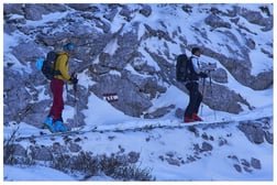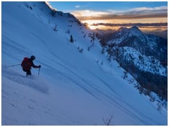 Abend-Skitour auf einen Nebengipfel des Monte Cacciatore; (Im Klettersteig-Bereich liegt dermaßen viel Schnee, dass ein Aufwärtswühlen zu viel Energie gekostet hätte.)