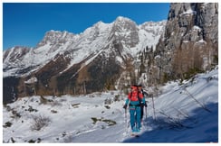 Zu besten Bedingungen ab Sella Nevea über den Kriegssteig 636 zunächst zur Prevala-Scharte, dann weiter zur Sella Monte Forato / Skrbina pod Prestreljenikom. Auch die Abfahrt über die italienische Kaninpiste zurück nach Sella Nevea bei einigermaßen geschickter Routenwahl ohne Steinkontakt.